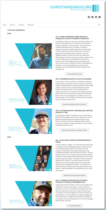 Webinars have been a frequent avenue of communication with the group. God led us to do our first webinar in January of 2020, just weeks before COVID-19 spread around the world. This opened the door to a series of webinars that enabled us to meet virtually throughout the COVID-19 years and right up to the present. The webinars included presentations from prominent Christian organizations on their innovative applications of GIS to advance their mission objectives. You can find the webinars here. The webinar series is ongoing, and we invite people to propose their own presentations on how they are using GIS to support sharing the Gospel.